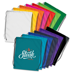 - Affordable drawstring backpack which is manufactured from 210D polyester and has riveted metal eyelets at the base for added strength.